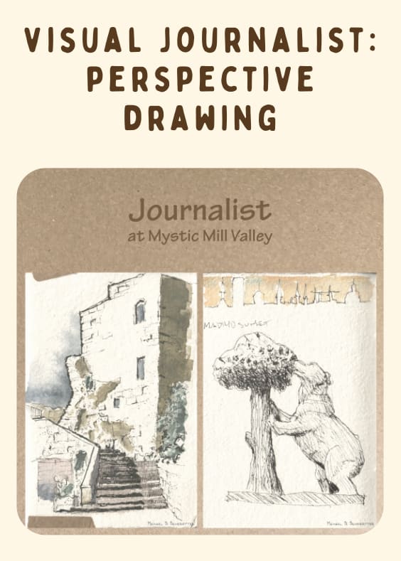A journalist is a person who keeps a journal. This workshop series gives a journalist concrete tools to create a journaling practice and fill rich visual journal pages with a variety of techniques. This catalog of techniques enables the journalist to have many options when challenged with capturing their journeys whether they are nearby or far away. This workshop will demonstrate and explain a technique for drawing one- and two-point freehand perspective drawings. Other techniques demonstrated in this workshop will be composition, drawing freehand straight lines, and accurately measuring your environment with just a pencil or a pen.